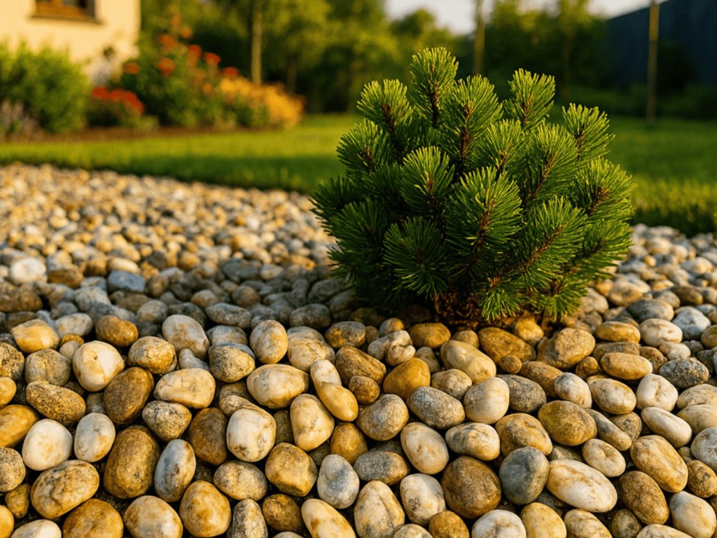 Doporučujeme pokládat na geotextilii ve vrstvě přibližně 4–5 cm, která zajistí stabilitu valounů a omezí prorůstání plevele.